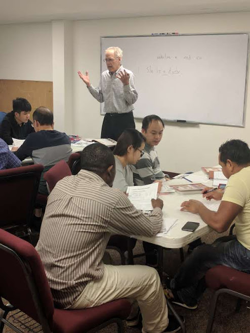 Our free English language/life skills classes meet from early September to early May on Monday and Wednesday mornings, 10:00-11:30, in the basement of the Good News Bible Church, 845 Pepperwood Lane. We typically have three to four levels of classes, low beginning through advanced, and tutors work with students with special needs. We often have students from 40-some different countries at any one time. More than 50% of our students are of low to moderate income.